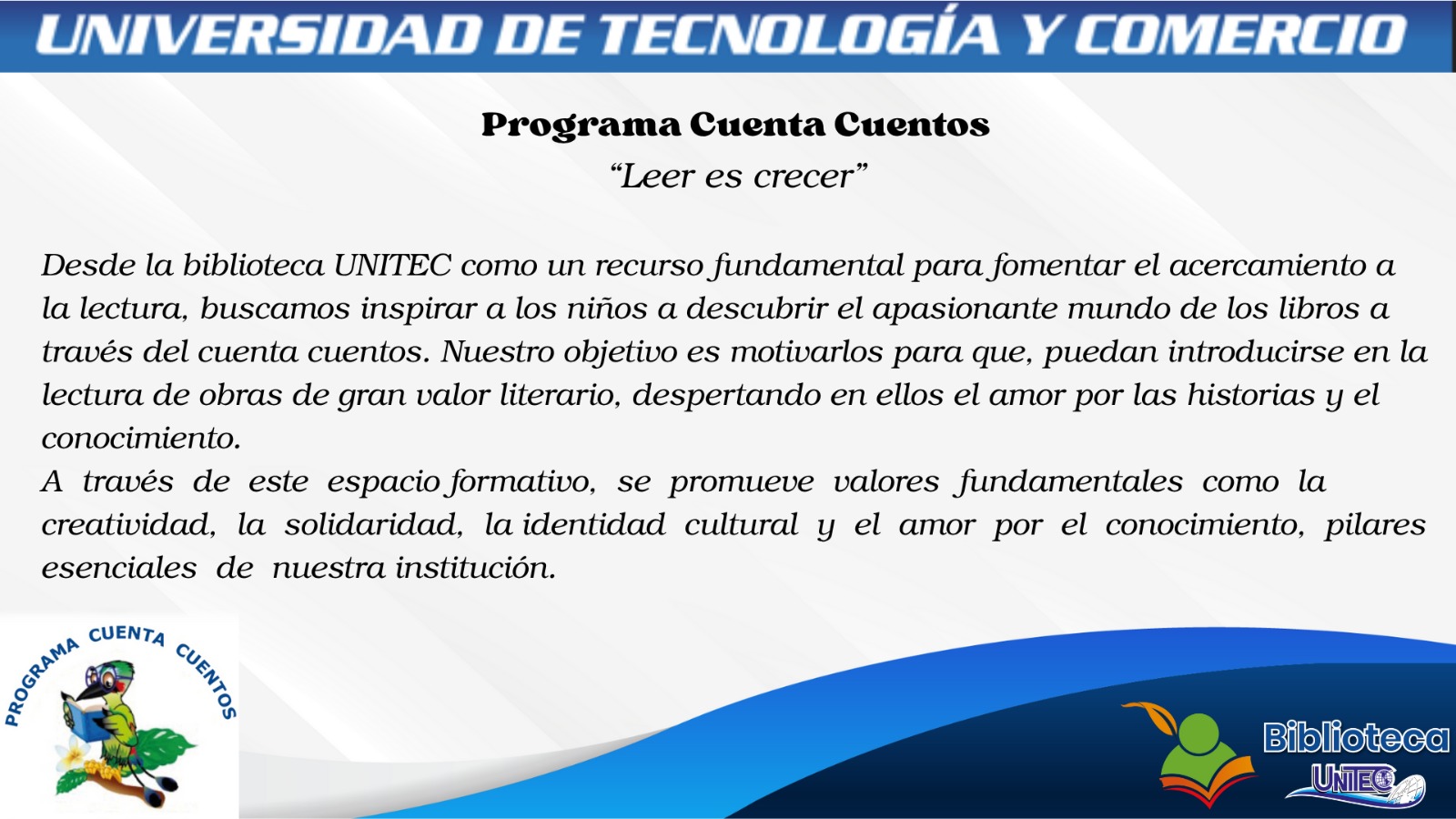 La Universidad de Tecnología y Comercio(UNTEC), desde el área de Biblioteca, propicia la vinculación con el medio a través de proyectos y programas, que fortalezcan la formación integral de la comunidad universitaria.